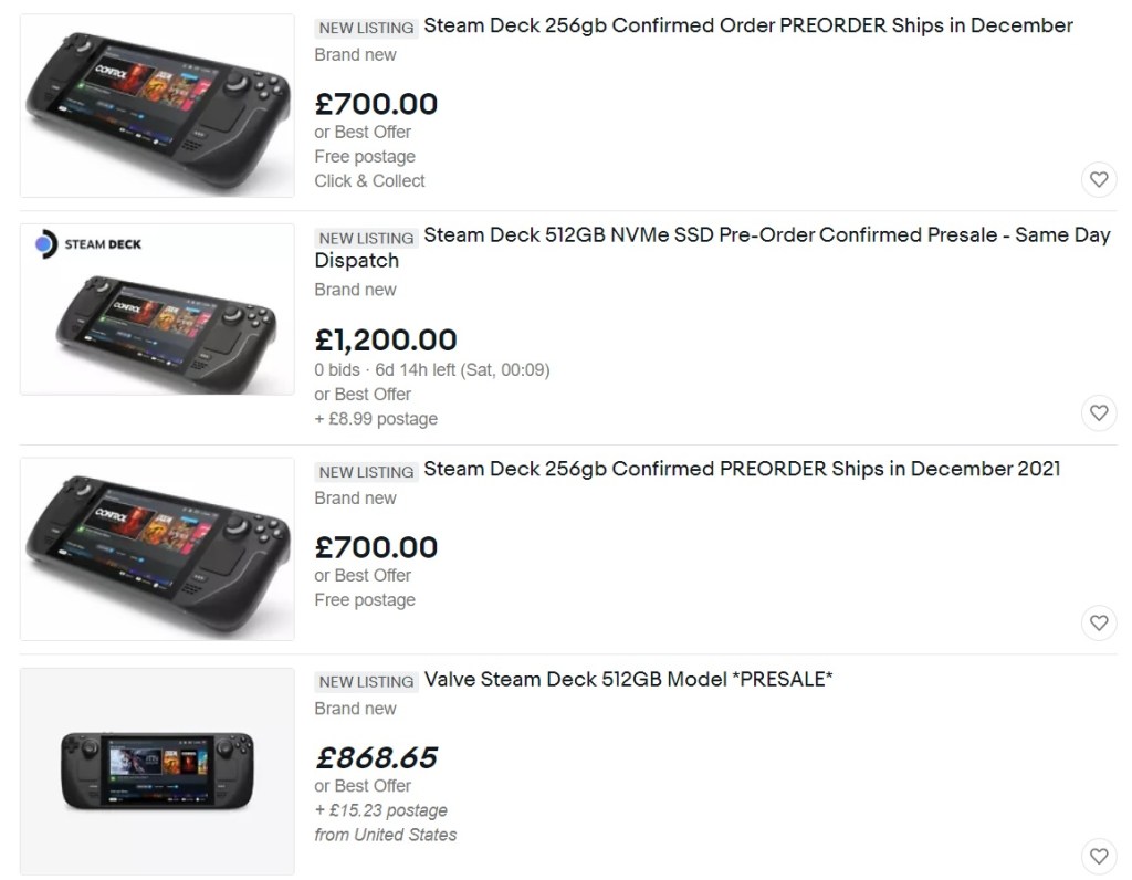 Op eBay bieden scalpers die Steam Decks hebben voorbesteld deze al aan tegen het dubbele en/of driedubbele van de prijs. Maar waarom zou je er reeds eentje op eBay reserveren/kopen als je nog meer dan een jaar moet wachten op het Deck zelf?