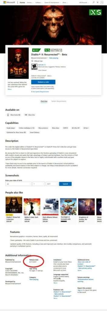 Volgens de Microsoft Store, en daar hebben ze ondertussen al een hele geschiedenis wat leaks betreft, zou de bèta van Diablo 2 Resurrected van start gaan op 17 augustus. Volgende week dus.