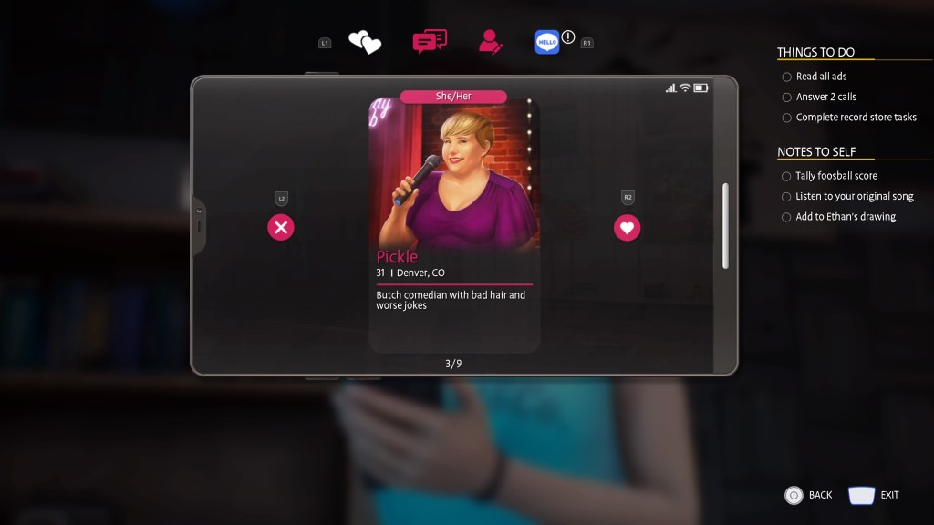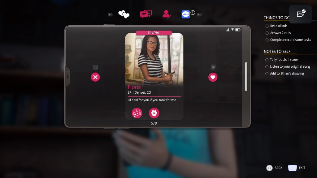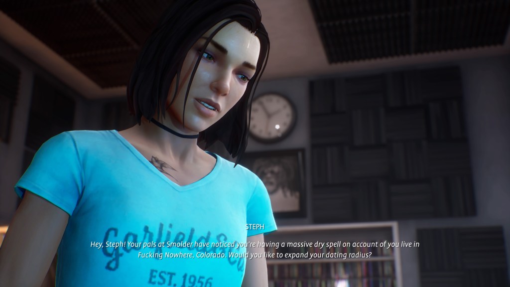 Over de verschillende fragmenten in de platenwinkel en radiostudio heen ontdek je steeds meer leuke details en nieuwe onthullingen. Je leert bij over de geschiedenis van de platenwinkel, de muzikale voorkeuren van de lokale bevolking, alsook over de roleplaying game die Steph actief GM’t. Deze ontdekkingen worden aangevuld door een resem aan conversaties die je op Steph haar smartphone voert met vertrouwde personages. Daarnaast kun je aan de slag met een ware Tinder-kloon waar je diepe gesprekken met potentiële liefdes aangaat. Er valt weer een hoop te ontdekken, en dit allemaal op een relatief klein oppervlak.