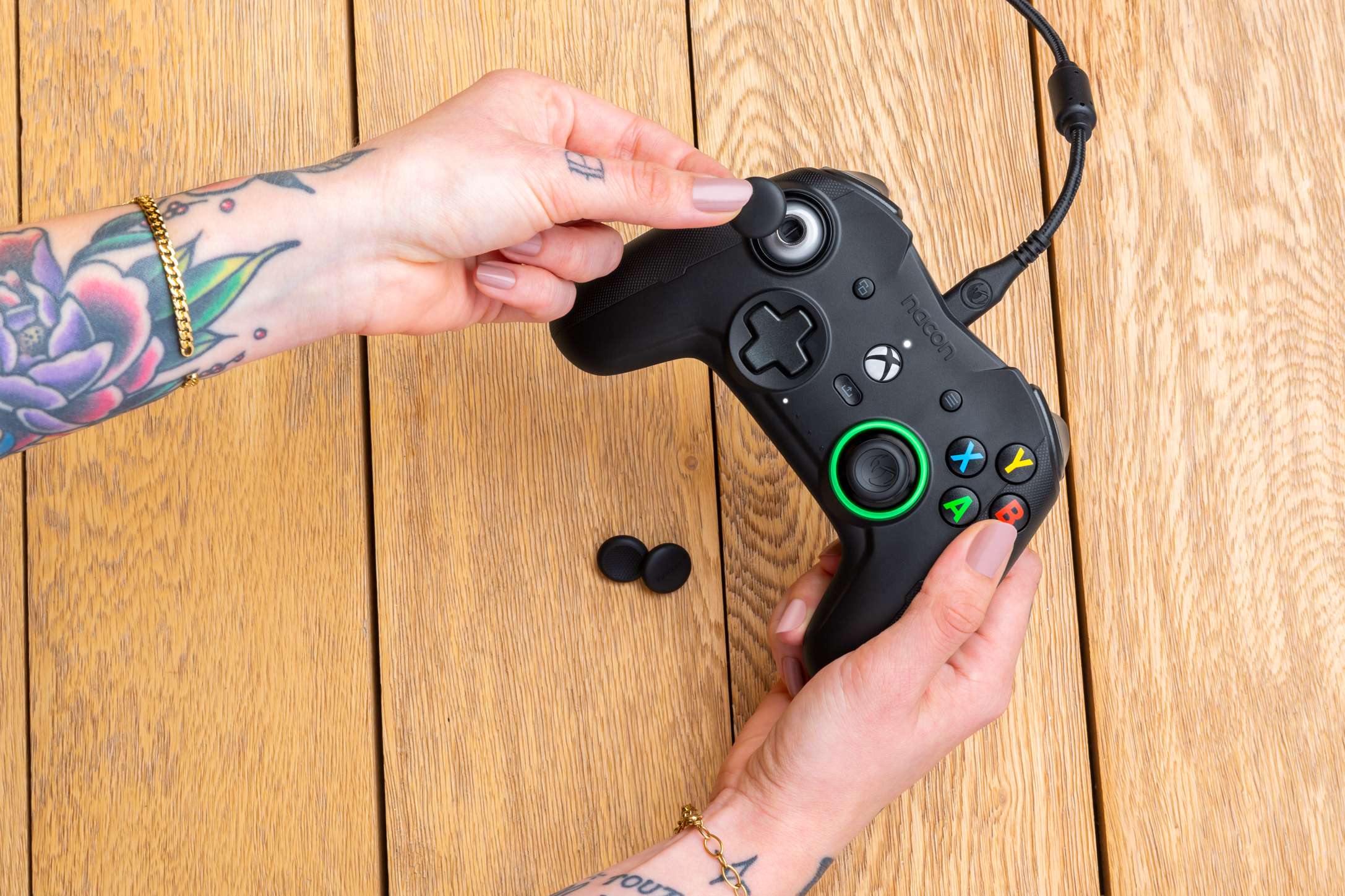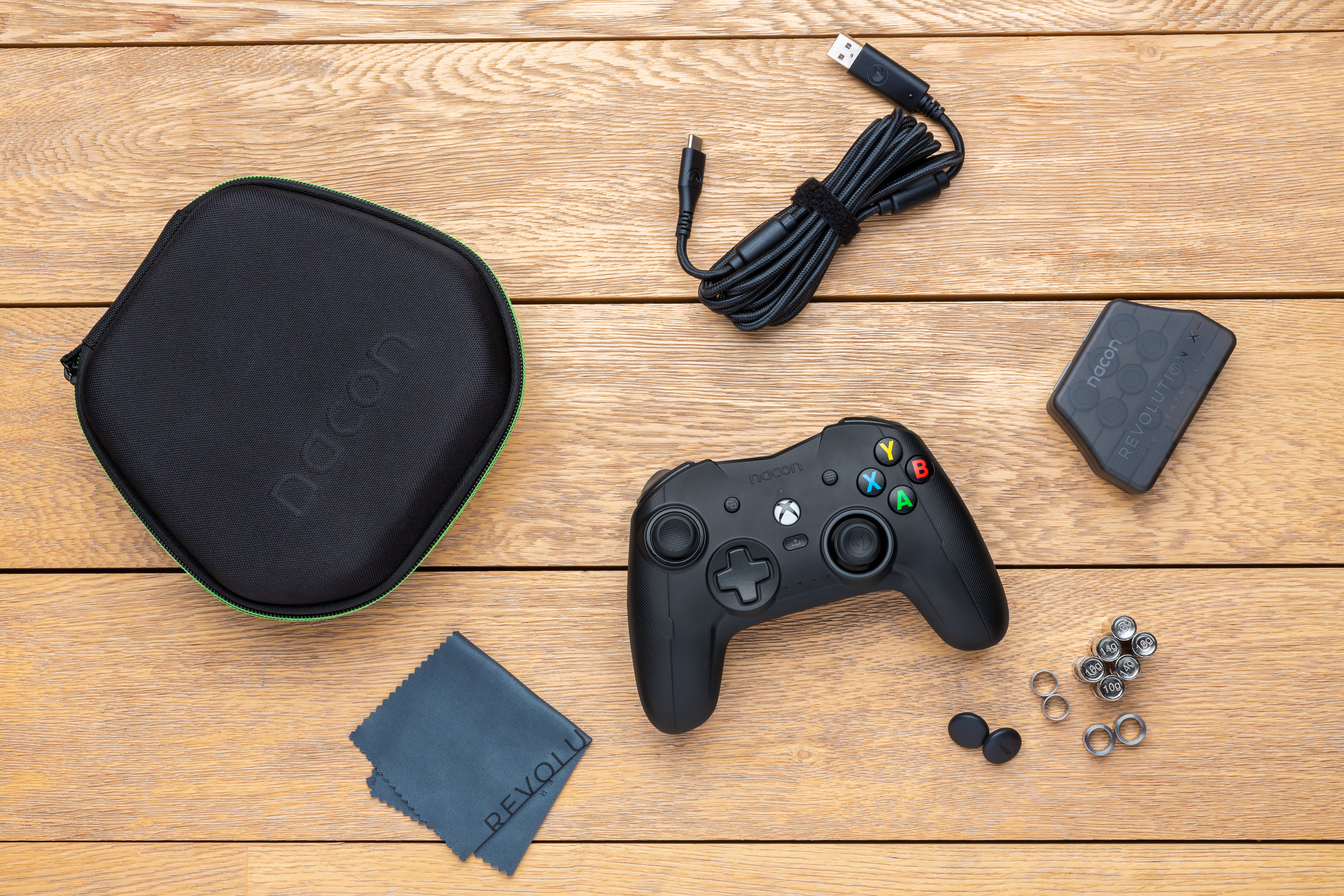 In de verpakking zit naast de case uiteraard ook de controller. Deze is met zijn 230 gram best licht te noemen. Maar Nacon levert een 6-tal gewichtjes mee, telkens een duo van 10g, 14g en 16g. Deze kan je naar wens wegstoppen onderaan de handvaten van de controller. Verder kan je nog de bewegingsvrijheid van de analoge sticks verkleinen door ringetjes over de sticks te glijden. Ook de toppen van de sticks zelf zijn te vervangen waardoor je kan kiezen tussen tops met kuiltjes of met een bultje.