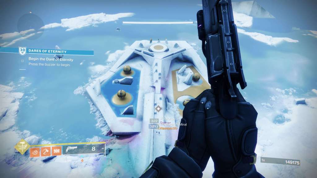 Guardians die die 25 euro liever aan een extra kerstkadootje uitgeven, niet getreurd! De leukste (en meest verslavende) activiteit in dit verjaardagsfeestje is voor iedereen beschikbaar: Dares of Eternity! In Dares of Eternity leiden Xƻr en zijn sterrenhengst ons doorheen een soort van televisieshow waarbij we enkele waves aan vijanden moeten zien te doorstaan. Welke soort vijanden we voorgeschoteld krijgen, hangt af van het Wheel of Fortune. Vervolgens vecht je je een weg doorheen verschillende waves aan Fallen, Cabal, Hive op zoek naar de hoogste score. Hoe hoger de score, hoe leuker de beloning. Opnieuw werd een nieuwe rank en sociale zone in het leven geroepen om de beleving dat tikkeltje Ʃchter en verslavender te maken.