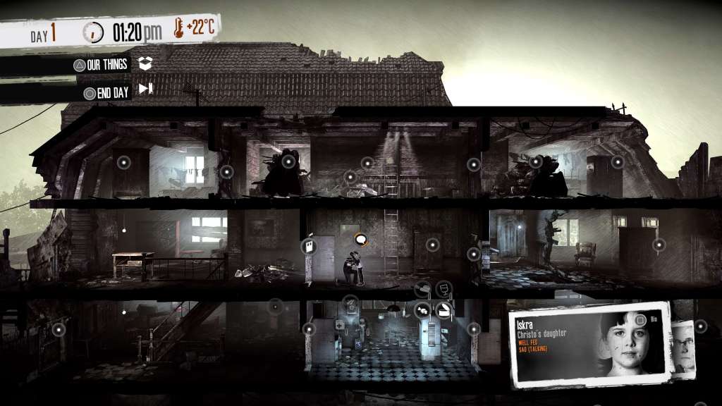 De game speelt als een side-scroller met als startpunt een huis of beter wat er nog van overblijft. Je neemt de controle over één of meerder personages. De man, vrouw of het kind worden voorgesteld met een foto (overigens van een echt persoon) Ze krijgen een korte biografie en een paar statussen toegekend. Het doel van het spel is simpel: overleven. En wat je daar allemaal moet voor doen, dat heb ik nog maar zelden in een game mogen ervaren. En het deed me luidop nadenken over wat voor iemand ik zou zijn in een oorlogssituatie. Want vaak lees je in games: jouw beslissingen hebben gevolgen.