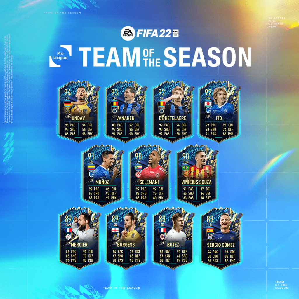 EA Sports FIFA Team of the Season viert het beste van het beste, spelers die het hele seizoen consequent hebben gepresteerd voor hun teams. De elf spelers in de Pro League TOTS-selectie zijn per direct beschikbaar in FIFA Ultimate Team.