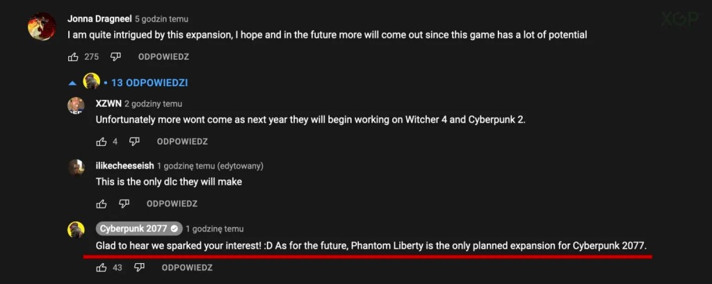 De reactie van CD Projekt Red hierop was: ‘Wat de toekomst betreft, is Phantom Liberty de enige geplande uitbreiding voor Cyberpunk 2077’. Dit nieuws werd intussen ook door de ontwikkelaar bevestigd aan website VGC.