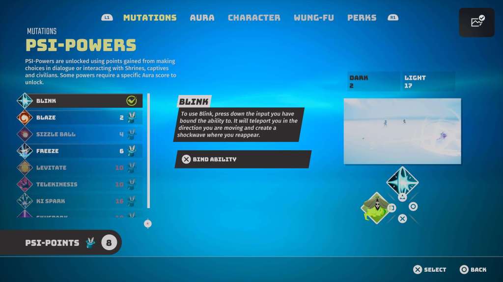 In Biomutant zal je geregeld voor een keuze komen te staan. We kennen natuurlijk dit fenomeen uit vele andere games. Je hebt keuze uit light of dark (aura). Ik koos ervoor om als brave koorknaap door het leven te gaan in mijn eerste speelsessie. Door deze keuze kon ik bepaalde abilities niet kiezen, want hiervoor moet je aura naar een bepaalde kant uitgaan.