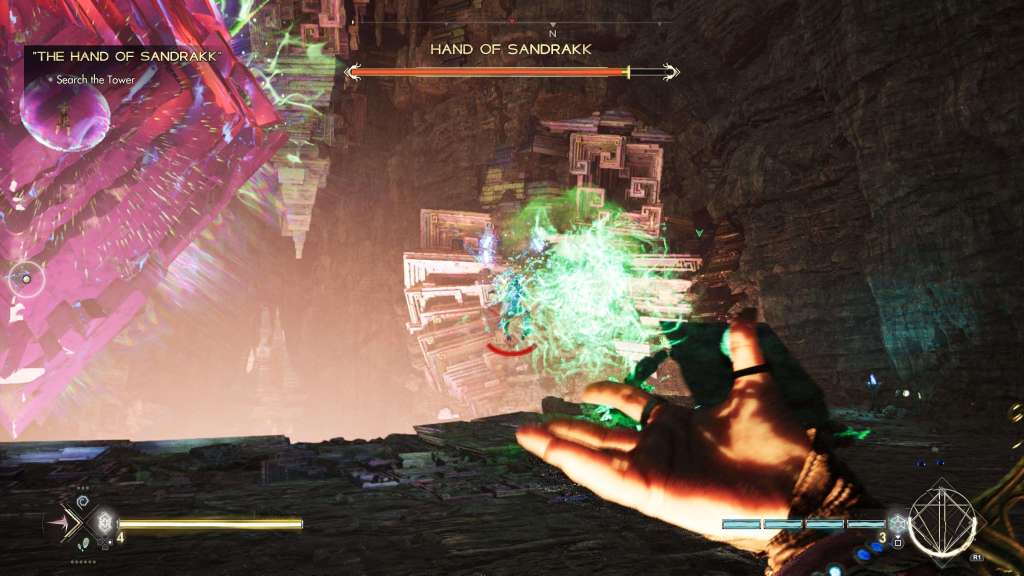 De combat verloopt in deze first person shooter anders dan we gewend zijn in het FPS-genre. We gebruiken geen vuurwapens maar pure magie en dat is echt fantastisch. Niet alleen het gebruik maar ook hoe het op het scherm wordt getoverd. Je beschikt over rode, groene en blauwe magie, maar elke kleur heeft ook zijn eigen manier van magie afvuren. Rood (shotgun) is perfect voor close combat. Let trouwens op de herlaadsequentie. Blauw kan je dan weer vergelijken met een enorm krachtige pistol en groene magie vuur je snel af, net zoals een submachine gun. Let wel op, want ik beschrijf hier de wapens die je bij de start van de game aantreft. Later in de game merk je dat het arsenaal enorm wordt uitgebreid en dat je rocket launcher gewijs doorheen je vijanden knalt.