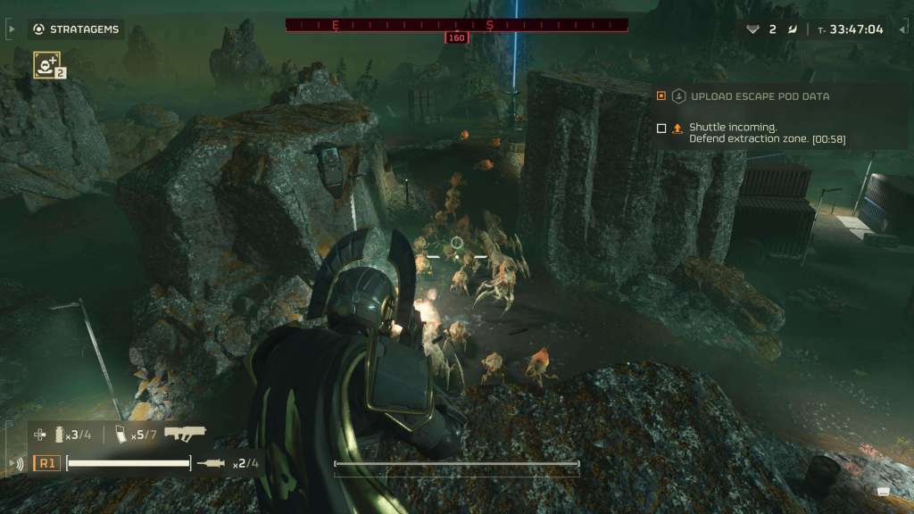 Strategems zijn hulpmiddelen die je kan inroepen via verschillende pijltjescombo’s. Zo kan je vanuit jouw moederschip een explosieve barrage oproepen, een bazooka laten neerdalen, extra ammo vragen of je gevallen soldaten terug redden. Er zijn ook vlammenwerpers, mijnenvelden en meer. Hoe verder je levelt, hoe zotter die zaken worden. Ze zullen vaak je leven redden en worden enorm fris gebracht.
