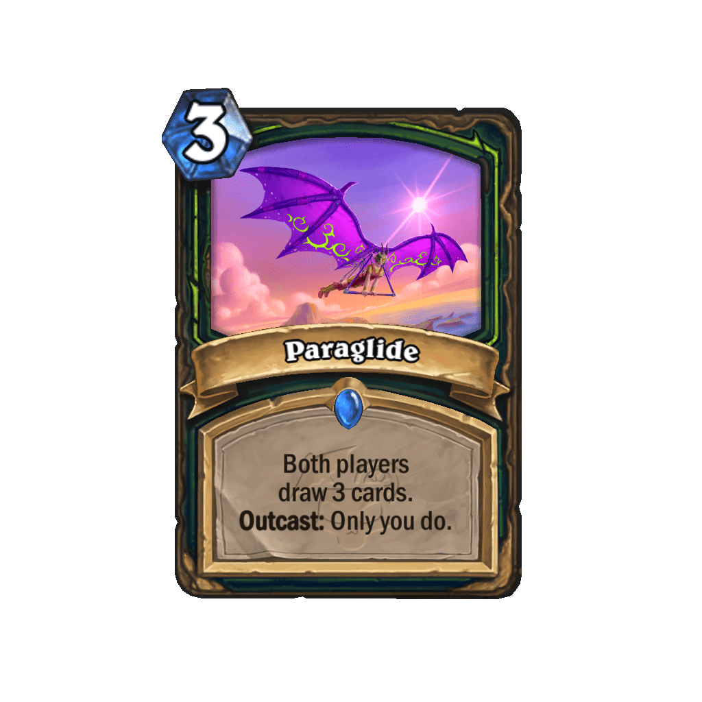 De paraglide (niet te verwarren met de naakte variant; de Pragaglide) is ook zo’n adrenalineboost van jewelste. De spell speel je voor 3 manapunten en zorgt ervoor dat beide spelers drie kaarten kunnen trekken. Speel je card vanuit een positie die uiterst links of rechts in je hand is, dan wordt de Outcast-eigenschap geactiveerd. Die zorgt ervoor dat enkel jij de kaarten mag trekken en de tegenstander op zijn honger blijft zitten.