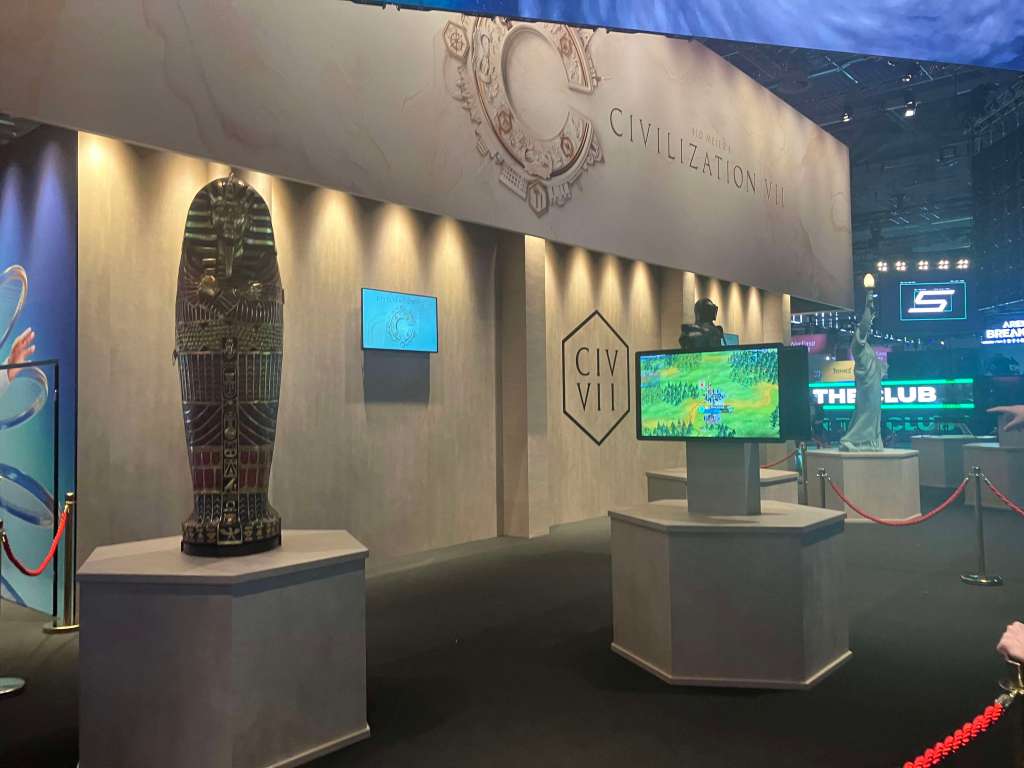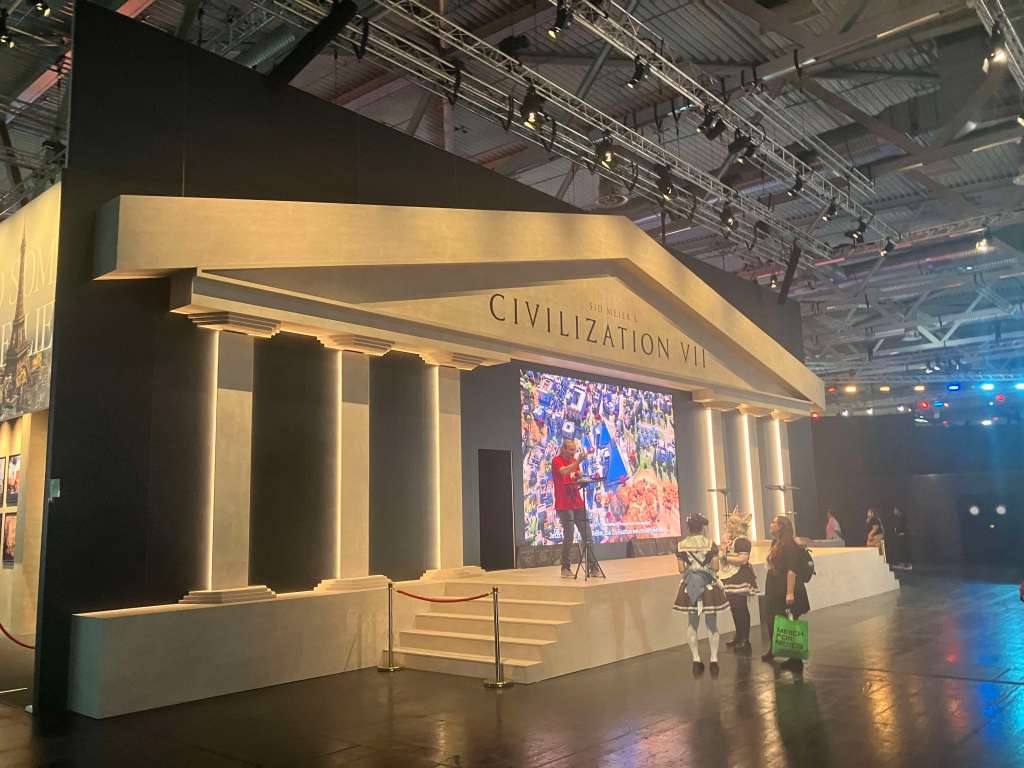 Je passeert beelden van ridders, het Vrijheidsbeeld en de Eiffeltoren. Er zijn ook verschillende artwork-kaders van de gamereeks zelf tegen de mooie marmer-achtige muren. Aan de andere kant van de booth vind je een prachtig podium op een Romeinse tempel. Heerlijke sfeer.