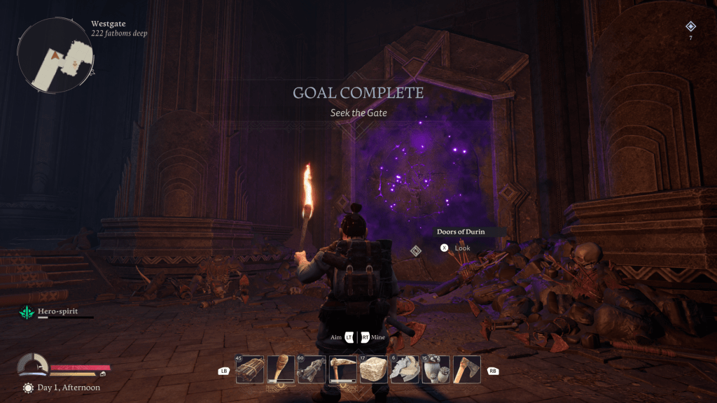 De volledige game speelt zich af in de mijnen van Moria, wie de LOTR-trilogie gezien heeft zal de immense hallen al snel herkennen. De game zit vol fijne details en verwijzingen naar de films. Zo kwam ik al snel een kamp tegen waar de Hobbits gevochten hebben. Het is dit soort toevallige ontdekking die ervoor zorgen dat Return To Moria je in het LOTR-universum zuigt. Fans van de boeken zullen dan weer Tolkiens voorliefde voor zang herkennen, want er wordt aardig wat gezongen in de game. Vooral tijdens het mijnen en dat geeft die redelijk monotone taak dan toch weer een vleugje luchtigheid.