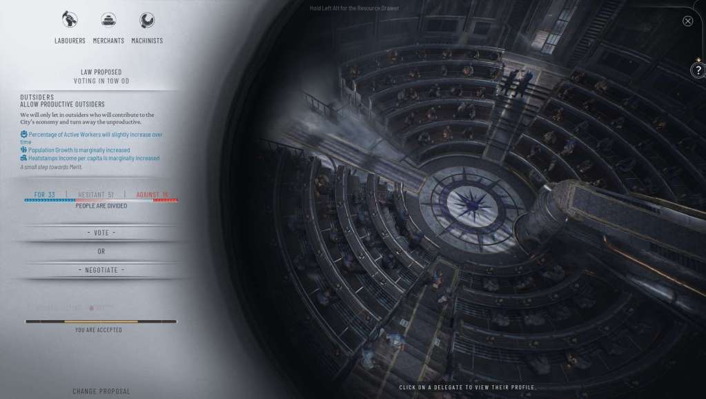 Wat ook enorm belangrijk is, is het plaatsen van je ‘Councill Hall’. Door bepaalde wetten voor te stellen vervaagt de chaos en spanning onder je mensen. In je parlement zitten 3 partijen: Labourers, merchants en machinists. Binnen deze fracties kunnen mensen zich afsplitsen waardoor er weer een nieuwe partij ontstaat. Elk met hun eigen eisen, noden en behoeftes. Opnieuw trachtte ik hier de kerk in het midden te houden en iets of wat goed te doen voor iedereen. Je kan wetten voorstellen voor 4 categorieën: Survival, City, Society en Rule. Sommigen leverden serieuze voordelen op maar soms moet je inboeten op andere vlakken.