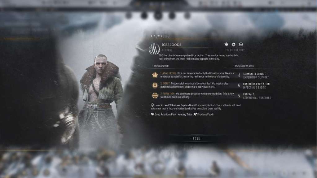 De mens is van nature een jager en wilt ook in deze omstandigheden er alles aan doen om te overleven. Je kan naar de ‘Frostlands’ gaan om een heleboel grondstoffen in 1 keer te vergaren. Voor deze expedities diende ik Frostland Teams samen te stellen. Wetten erdoor krijgen, Logistics districts bouwen en vooral veel research doen helpen je om ver buiten de muren van je stad te gaan verkennen. In ‘The Frostland’ kunnen kolonies worden geplaatst waardoor het nog uitgebreider wordt.