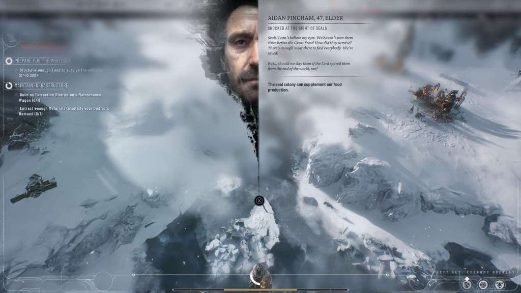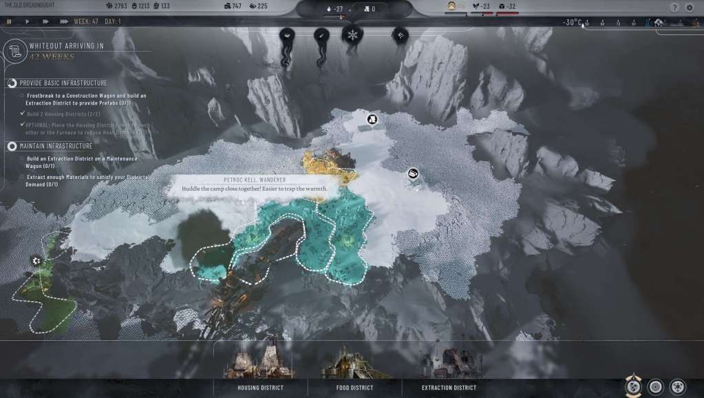 De bittere realiteit wordt vaker in je gezicht gesmeten dan het aantal sneeuwballen in een sneeuwballengevecht. De game strafte me telkens weer mentaal af wanneer ik rechtsonder de melding kreeg ’29 people frozen to death’ of ’38 people got sick’. Gaandeweg kon ik dit aantal verminderen door mijn districts tactisch te plaatsen. Verder in deze review ga ik daar dieper op in. De game neemt je in het begin bij de hand maar dan nog ging ik als RTS-leek elk menu af om Frostpunk 2 beter te leren kennen en vooral begrijpen. The Wanderers voeren een race tegen de klok en ik als speler moest hun voorzien van warmte, voeding en een dak boven hun hoofd. Je krijgt (in story/citizen mode althans) 88 weken om alles op orde te krijgen en je mensen tevreden en levend te houden.