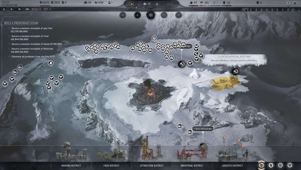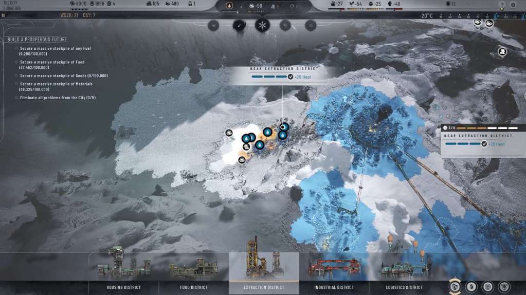 In het begin kon ik beroep doen op drie districten, housing, extraction en food. Daar komen later ook nog industrial en logistics bij. Industrial zorgt vooral voor het maken van nog meer grondstoffen en dient meer als bonus. Logistics daarentegen richt zich vooral op relaties met kolonies, outposts en het transport van grondstoffen naar en van je stad. Die laatste worden (bijna) altijd geplaatst aan de rand van de map.Het tactisch plaatsen van districts leverde mij ook bepaalde voordelen op. Een housing district plaatste ik het best bij de centrale generator om mijn mensen van warmte te voorzien. Dit wordt ook aangegeven in balkjes om echt het onderste uit de kan te halen en het maximale van je bonussen te benutten. Voor je ergens kan bouwen diende ik wel de ondergrond eerst ijsvrij te maken. Dit kan je doen door middel van frostbreaking. Dit kost een bepaald aantal werkkrachten (tijdelijk) maar ook heatstamps. Heatstamps krijg je iedere ingame week en vermeerdert bij uitbreiding van je stad, bevolking en districts errond.