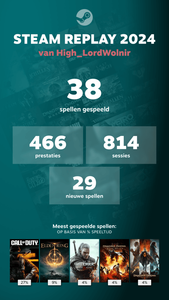Het was voor mij geen verrassing dat november de maand was waarin ik het meeste actief was op Steam aangezien ik die hele maand verlof had. Call of Duty, Elden Ring en The Witcher 3: Wild Hunt waren mijn meest gespeelde spellen in 2024. Soulslike-games, Cyberpunkachtige games en games met zombies zijn blijkbaar mijn favoriete genres. En daar kan ik mij best in vinden.