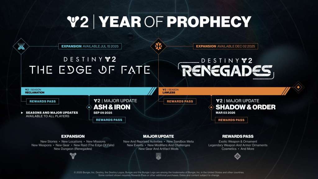 Vanaf Year of Prophecy zal elk jaar voortaan vier grote contentmomenten bevatten: twee betaalde uitbreidingen en twee grote updates die voor iedereen beschikbaar zijn. Deze updates bevatten nieuwe activiteiten, exotische missies, nieuwe uitrusting en beloningen — waaronder exotische wapens — en meer. Het mooiste is dat deze nieuwe structuur geen betaalde toegang tot seizoensactiviteiten vereist. Zo zorgen ze ervoor dat alle spelers samen de evoluerende spelwereld kunnen ervaren. Bekijk hieronder alles wat eraan komt in de Year of Prophecy Roadmap.