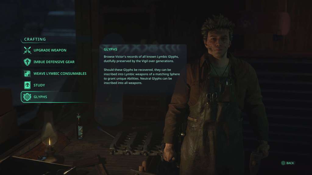 Rémi beheerst een breed arsenaal aan wapens: dual axes, een greatsword, een zwaard en een polearm. Elk type biedt een unieke speelervaring, zeker als je ze later voorziet van Glyphs. Zodra je wapens kunt upgraden, worden glyphs essentieel. Je hebt keuze uit vijf soorten: Rage, Grief, Terror, Ecstasy en Neutral.