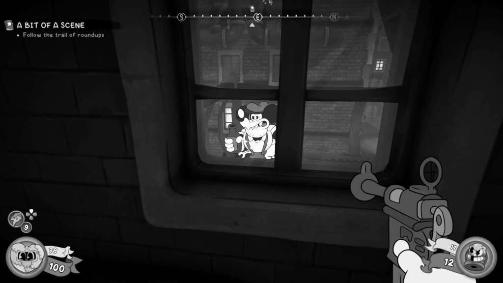 Mouse P.I. For Hire schittert eerst en vooral door zijn visuele stijl. Daar moeten we niet moeilijk over doen. Al was het wél even wennen, want het is toch een speciale manier van spelen. De typische zwart-wit rubberhose‑animatie voelt niet alleen uniek, maar ook levendig en speels. Ik had écht het gevoel dat ik door een oude Mickey-cartoon wandelde waar plots een machinegeweer werd bovengehaald. Je merkt ook dat de ontwikkelaars veel liefde hebben voor dit type tekenfilms.